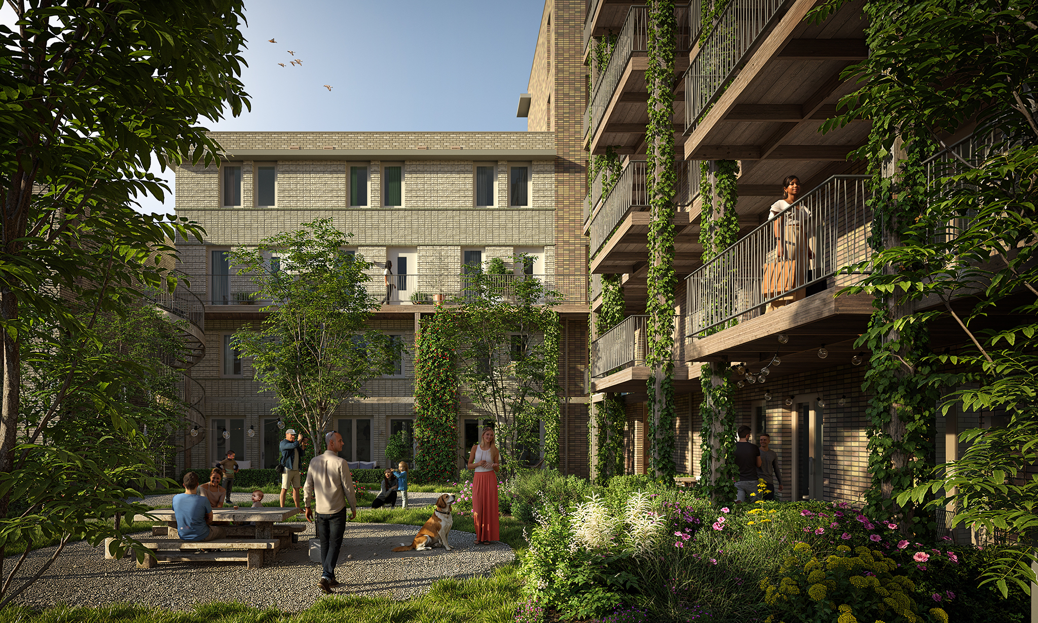 De centrale binnentuin en de gemeenschappelijke ruimtes stimuleren ontmoeting tussen bewoners, terwijl slimme oplossingen bijdragen aan biodiversiteit en duurzame mobiliteit.