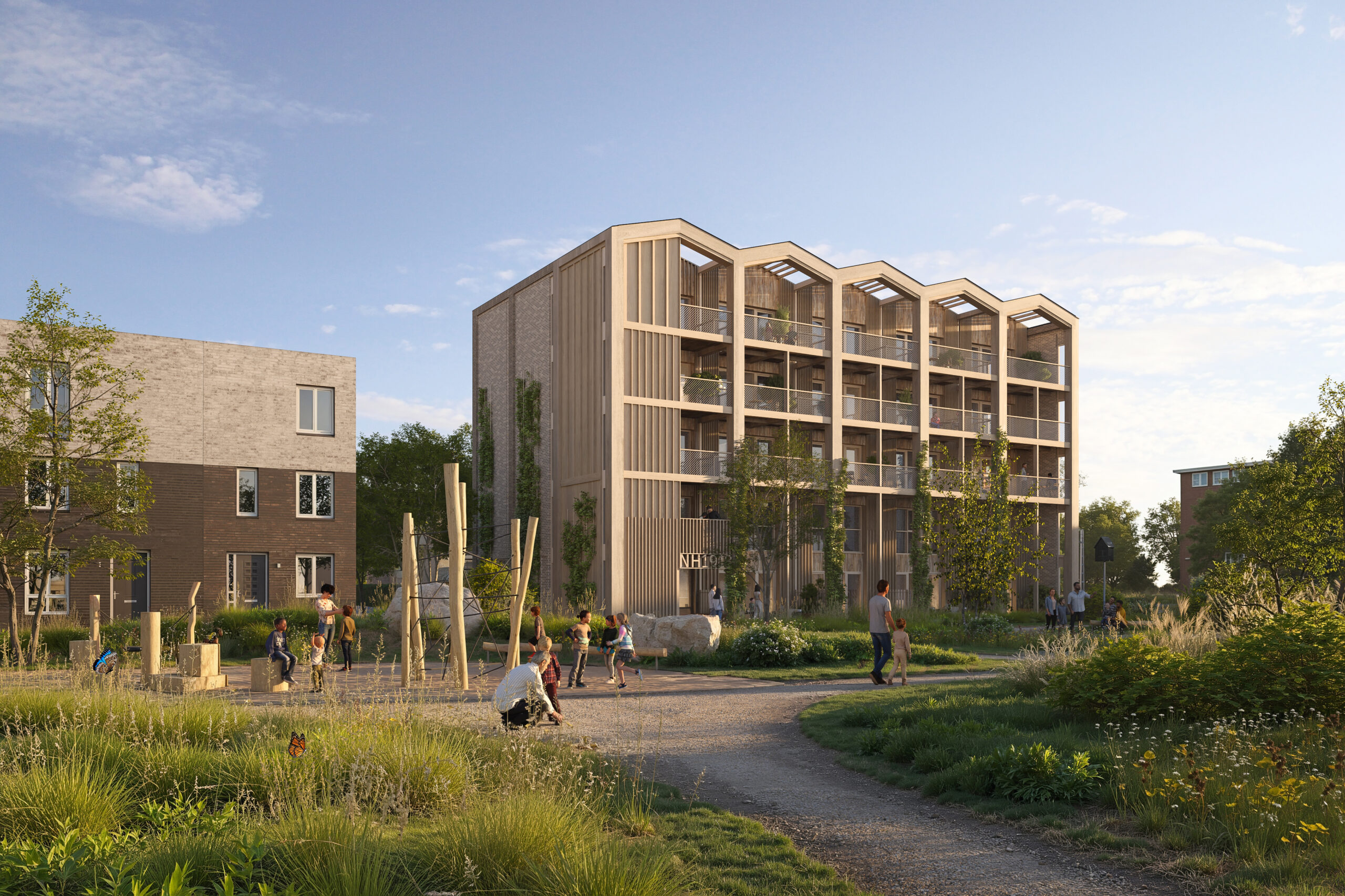 In de buurt Noorderhaven in Zutphen realiseren wij in samenwerking met Holleman Ontwikkeling 20 wooneenheden, bestaande uit 16 appartementen en 4 maisonnettes dat grotendeels gebouwd wordt in hout en voorzien wordt van een CO2-negatieve gevelsteen. Daarmee beperken we de uitstoot en bouwen we toekomstgericht. Ook sociale duurzaamheid heeft een belangrijke plek in het ontwerp. Het gebouw richt zich op jongeren, starters en mogelijk senioren. Ontmoeting wordt gestimuleerd door een mix van woningtypen, een ruime entreehal en een leefgalerij aan de parkzijde. Buitenruimten, ontworpen door TLU, zijn gericht op zon en groen en dragen bij aan rust, gezondheid en contact.
